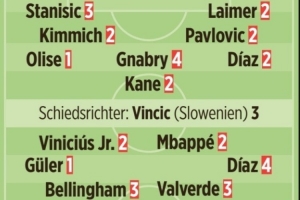 图片报评分:于帕、居莱尔1分 姆巴佩2分 诺伊尔5分 卡马文加6分